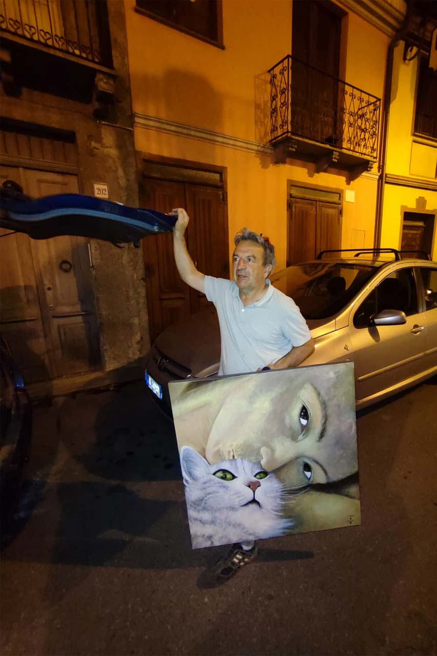 Col nome d’arte di Kimbe quella di Carboni è una storia di frazioni e di affastellamenti ininterrotti. Non smette di fare arte da quando, al politecnico di architettura a Firenze, lo raggiunge la notizia della morte di Salvatore Deidda, siamo nel maggio del ‘90 e quella mancanza si fa appuntamento col tempo e con lo spazio. Perché organizzerà, 30 anni più tardi, la prima retrospettiva sull’isola dello straordinario fumettista della Bonelli. Ma l’università è solo un espediente per attrarre legami profondi, dopo i finanziamenti degli anni Novanta per il recupero storico, a Seui sarà il loft del centro storico a ospitare la Fabbrica di Kimbe, laboratorio o open space di istallazioni e vernissage in divenire. «Scolpire e dipingere sono pratiche che ho affinato nel tempo, sono in grado di dire che la responsabilità di queste scelte non è quasi mai mia: se serve per la mia piccola comunità che io usi una macchina fotografica o una pala, non lo posso sapere prima, lo incontro nel corso del mio viaggio e lo faccio. Questo è l’imperativo che voglio accettare.»