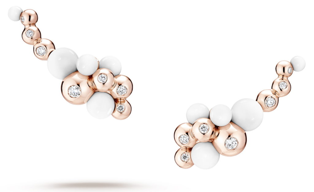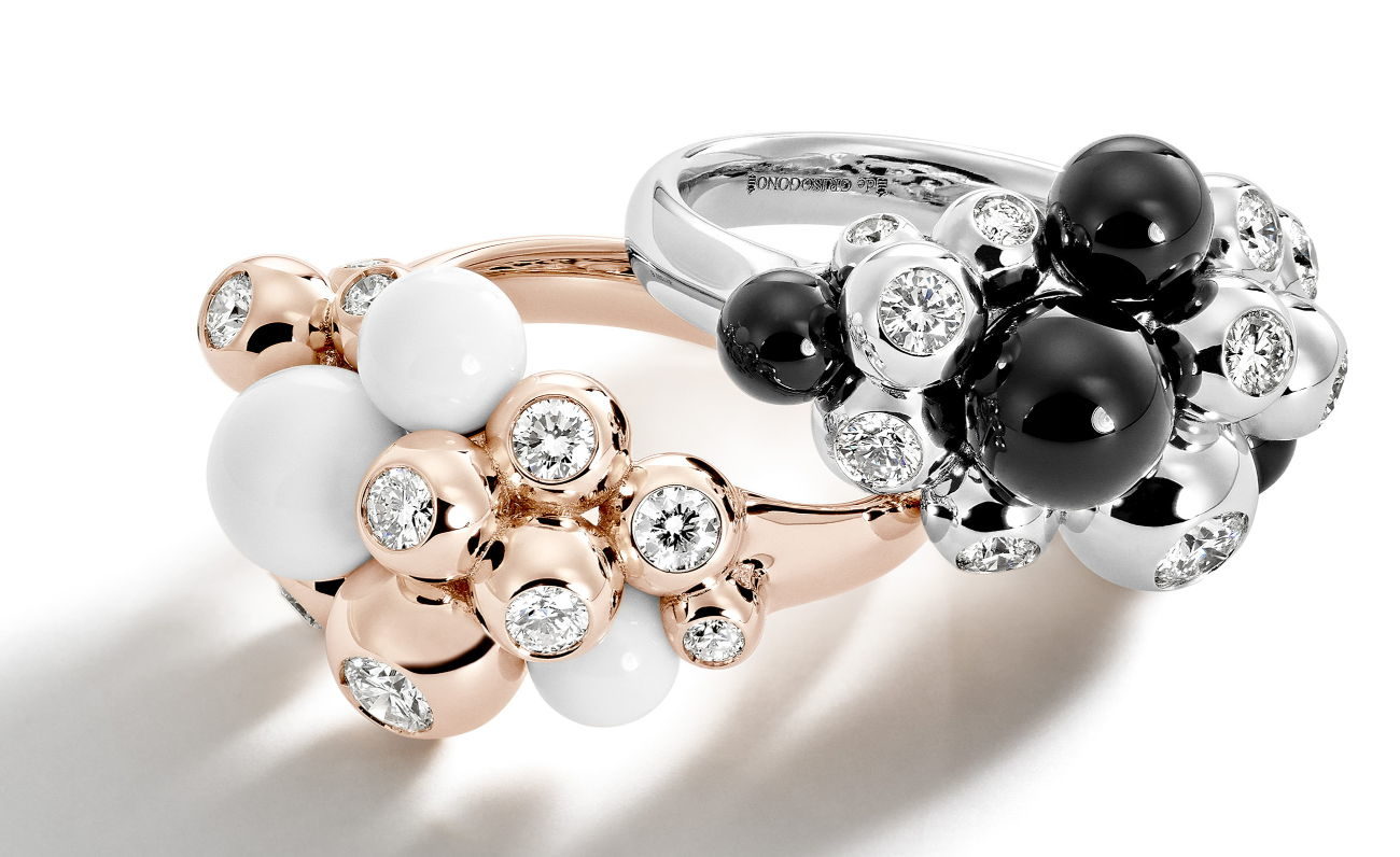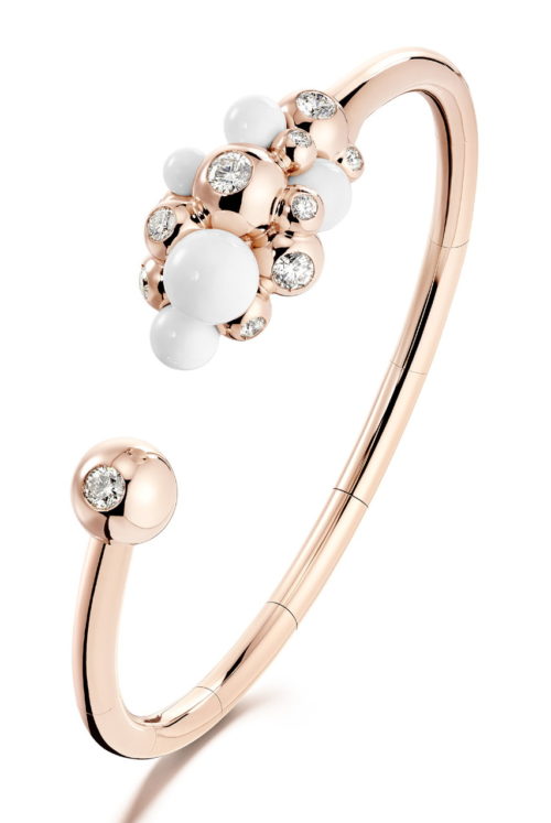 La nuova versione della collezione Boule, dalla medesima forma inconfondibile dell’originale, perfetta e seducente, fa della semplicità la sua forza. Ultra femminile e sensuale si propone in un turbinio di minuscole sfere costellate di cacholong, onice e oro rosa chiaro, o oro rosa con diamante taglio brillante, sotto forma di anello, bracciale o come earcuff per un look trasgressivo.
