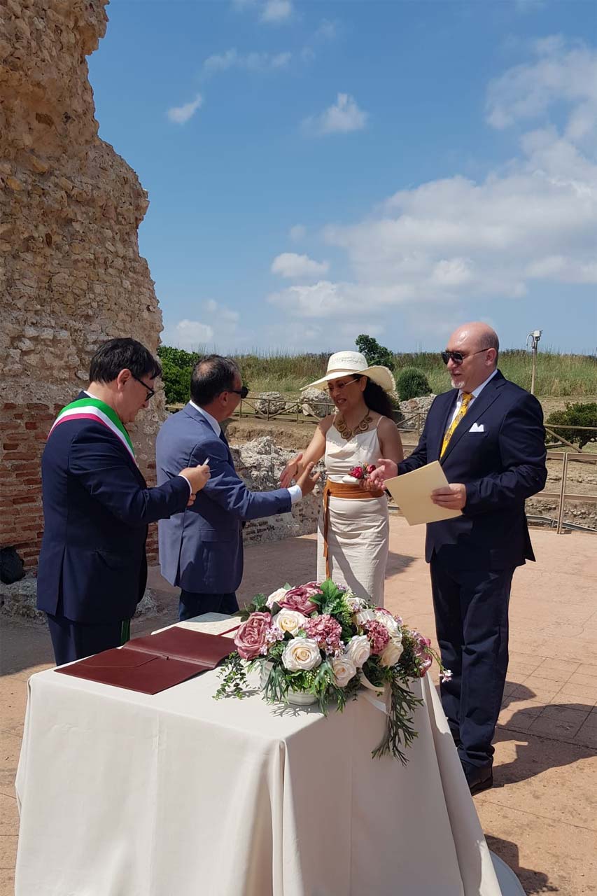 Angela Demontis, professione ricercatrice, davanti ai testimoni e al presidente del consiglio comunale Franco Satta, che ha celebrato l’unione civile con il supporto del portavoce Antonio Chessa, dice: «Abbiamo voluto, per questa cerimonia speciale, la cifra della semplicità.» Quasi come se non si potesse aggiungere troppa bellezza alla portata di un tale patrimonio archeologico.