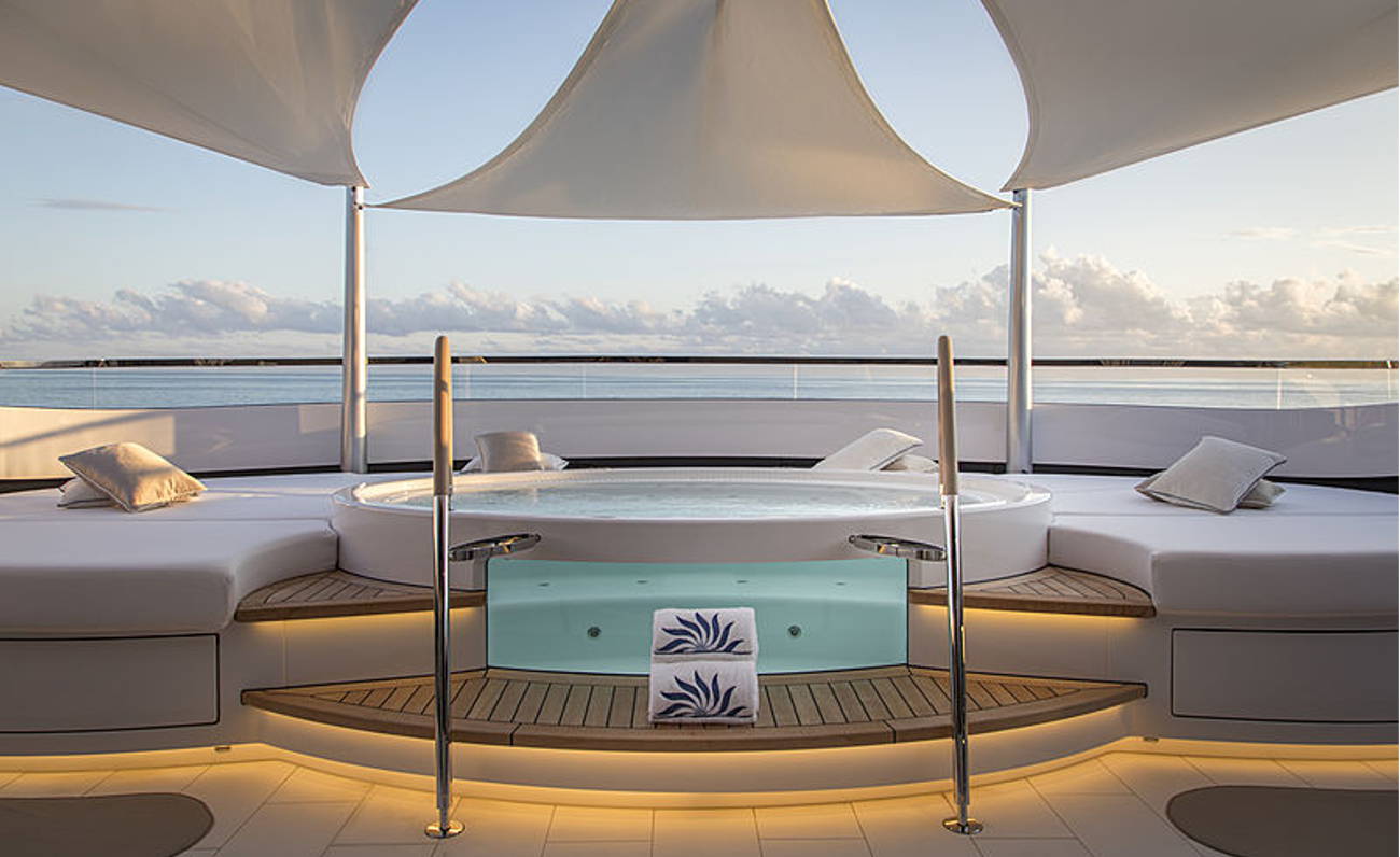 La filosofia applicata alla sovrastruttura in cristallo che ruota lungo tutte e due le murate laterali e a prua è replicata nell\'interno, come ad eliminare ogni differenza tra dentro e fuori. E così nelle sale il vetro produce viste panoramiche dal pavimento al soffitto a poppa, a babordo e a dritta in un continuo gioco di rimandi e riflessi. Per dare maggior luminosità si è optato, invece dei classici legni scuri, materiali alternativi, più “terrestri”, come come tessuti pregiati, carta da parati o, lacca con effetti 3D. E quando si è scelto il legno si è preferito l\'acero grigio sbiancato, do il sicomoro in diverse sfumature che vanno risaltare i piccoli dettagli in legno Carballo colorato. Non per nulla «il tema principale è la natura – come ha dichiarato Valentina Zannier, chief interior designer e junior partner a Nuvolari Lenard. - Con abbondanza di temi floreali, ma anche piume, onde, pesci… tutto all’interno di un’atmosfera che vuol far sentire sempre a suo agio chi è a bordo, in qualsiasi luogo dello yacht. Tutta questa ricchezza è però quasi invisibile, espressa dalla qualità dei dettagli e dalla raffinata combinazione di finiture create su misura». Grande attenzione è stata data alla master room, la principale, che si trova al piano superiore e garantisce una totale privacy ed è dotata prua di una propria vasca a idromassaggio. Sono offerte possibilità di personalizzazioni pressoché infinite. (Fabio Schiavo)