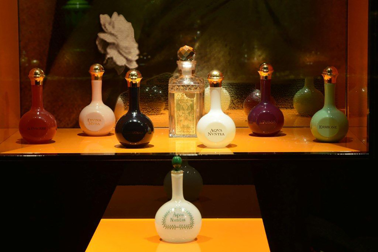 - Visione ravvicinata dell’Officina dell’Aqua Nuntia. Al centro, in primo piano, l’ampolla originale di d’Annunzio conservata in Prioria a corredo, tutt’intornole ampolle della linea Odorarius Mirabilis.