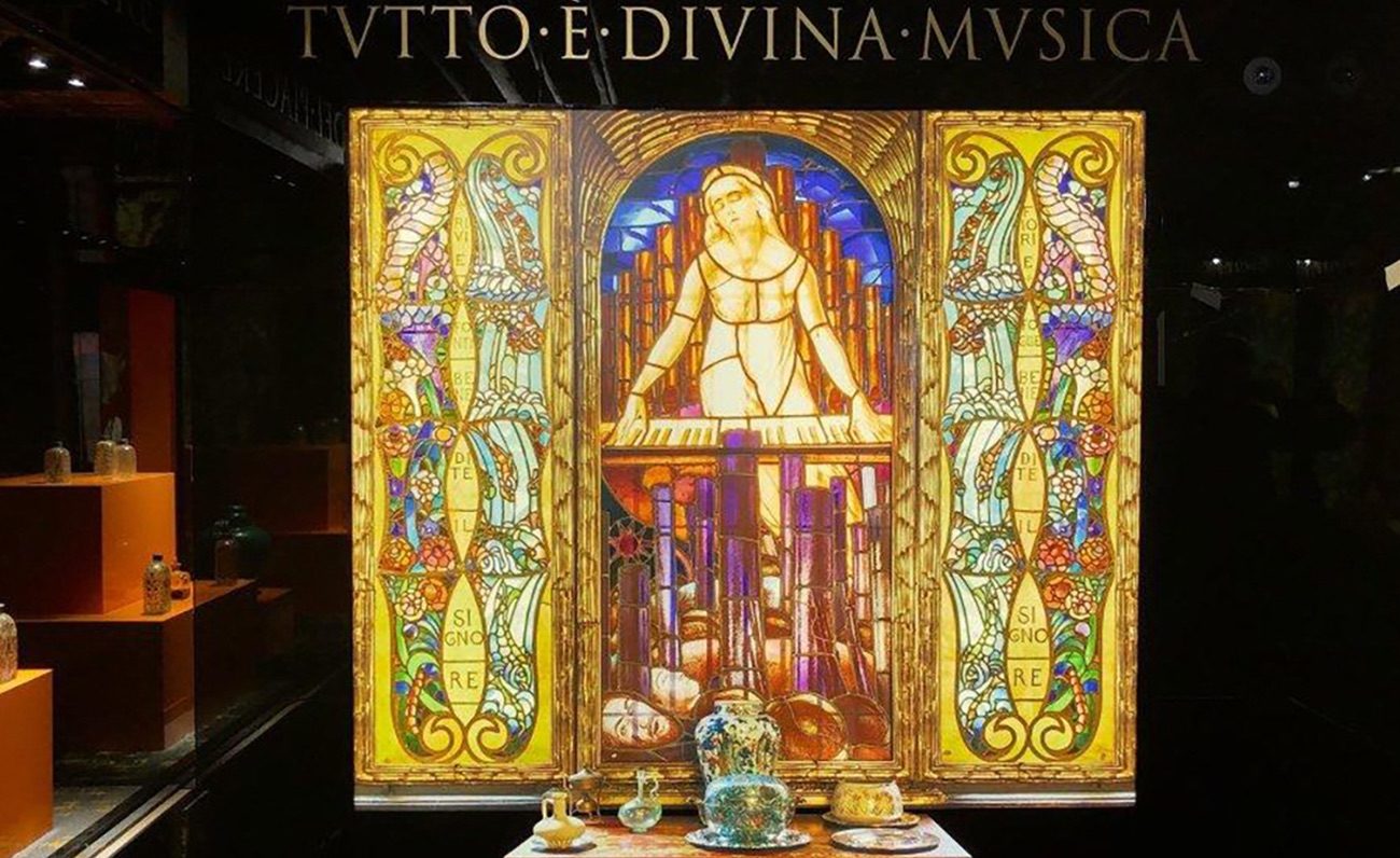 - Visione d’insieme della Cappella di Santa Cecilia dominata da una riproduzione di una vetrata consacrata alla Santa. In alto la scritta TUTTO È DIVINA MUSICA