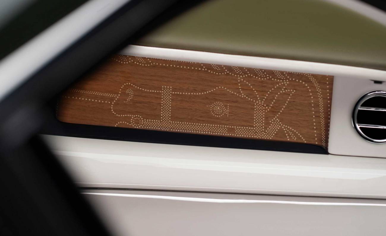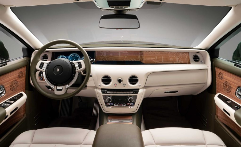 Gli interni sono così rifiniti in pelle Hermès Enea Green, che ricopre volante, maniglie, leva del cambio e dei comandi per le impostazioni del clima. Questo rivestimento ricopre anche le superfici meno visibili, tra cui il vano portaoggetti, su cui è impressa la firma Habillé par Hermès Paris. Sui braccioli delle porte, sulle console centrale e posteriore e sul rivestimento del padiglione è invece inciso il celebre motivo “Toile H”. Per la Phantom\'s Gallery - l’originale placca distintiva che percorre la lunghezza del cruscotto di ogni Rolls-Royce - Hermès ha invece commissionato un\'opera d\'arte dipinta a mano ispirata ai progetti del celebre artista e illustratore francese Pierre Péron.