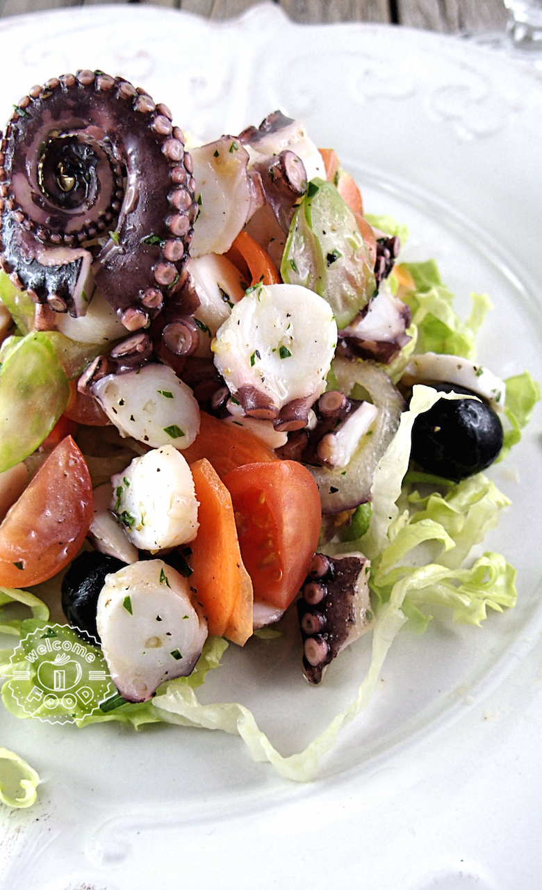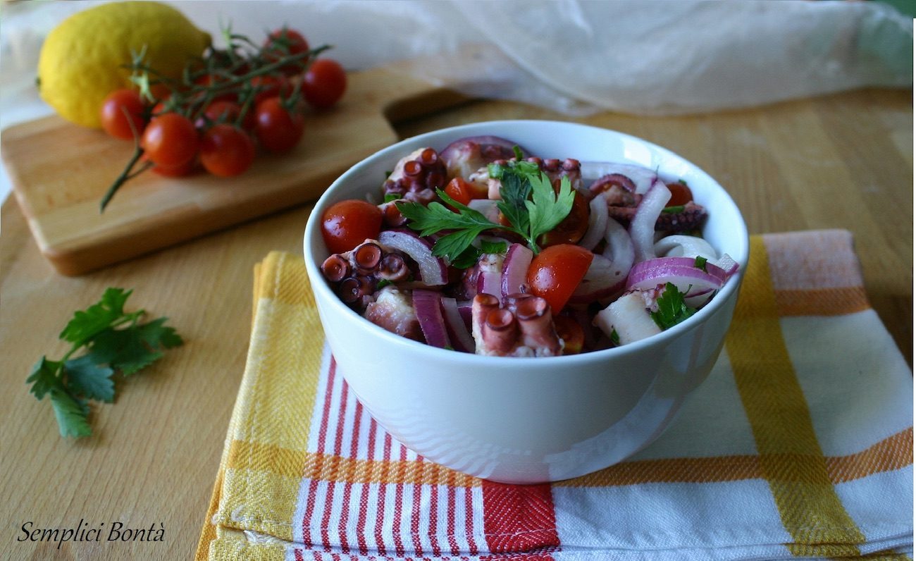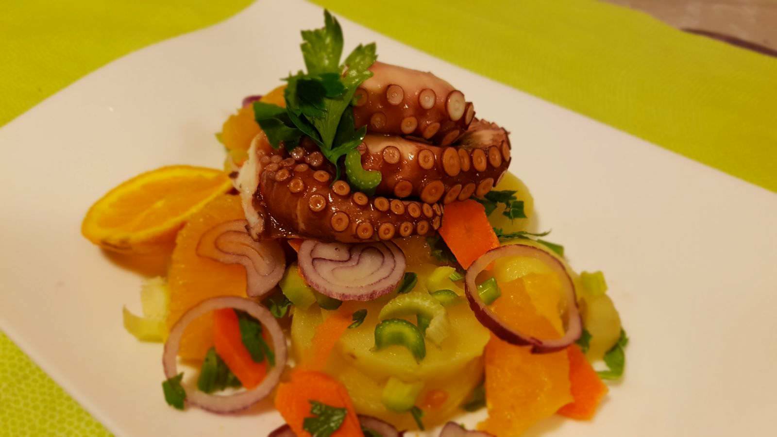 Tipico antipasto estivo della Sardegna, gradevole in ogni stagione dell\'anno, il polpo alla catalana è un\'insalata, con cipolle, olive nere, pomodorini, carote e sedano, perfetto da gustare fredda.