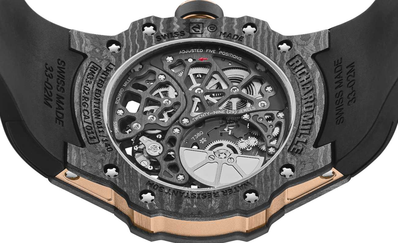 L’RM 33-02 è alimentato dal movimento scheletrato RMXP1 a carica automatica realizzato in titanio grado 5. È equipaggiato da un microrotore decentrato in platino che consente abbassare l’altezza complessiva del movimento a 2,60 mm. La platina rifinita tramite sabbiatura umida e rivestimento superficiale Titalyt, le superfici micropallinate, satinate e le smussature degli spigoli -tutti realizzati interamente a mano - mettono in risalto i volumi, giocando con le ombre e le luci grazie ai motivi grafici della scheletratura.