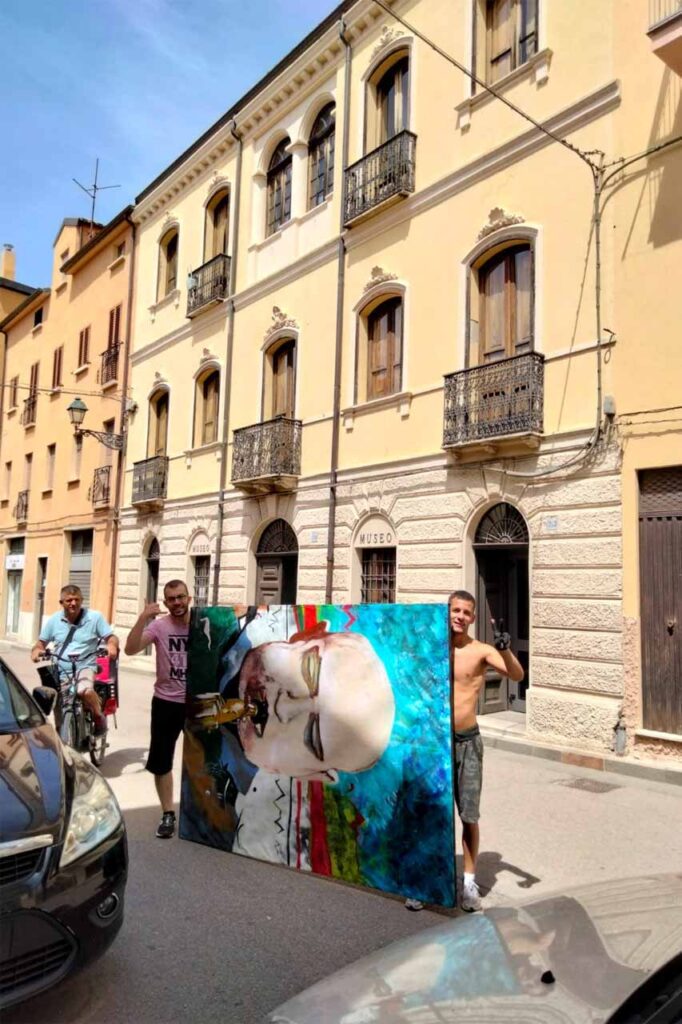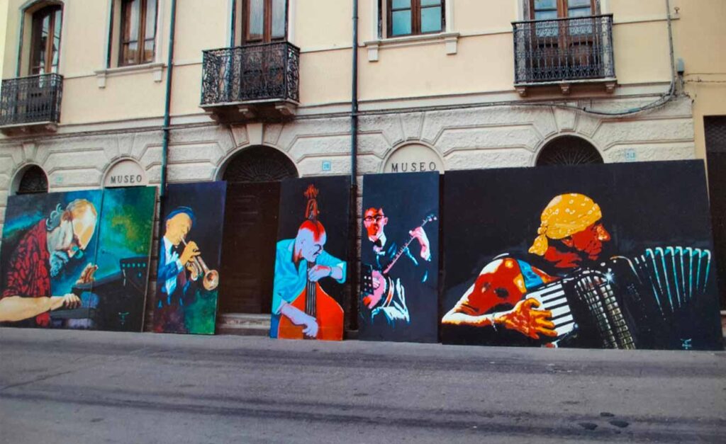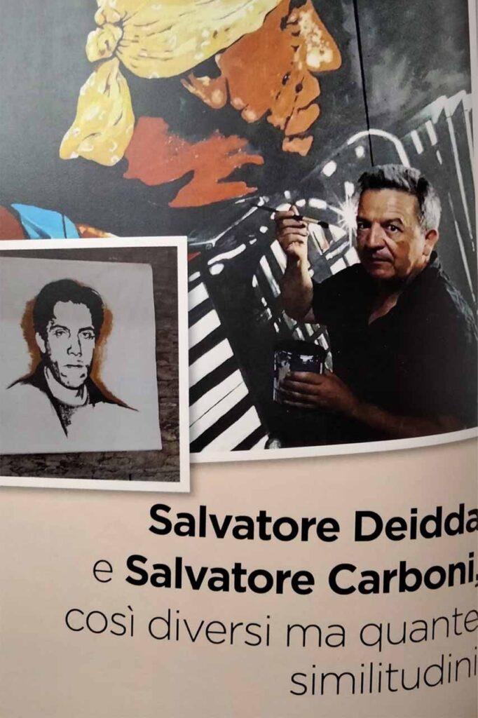 Salvatore Carboni si inventa il murales da asporto «…perché lo posso schiodare, non mi va di sovrapporre un’immagine bidimensionale su di un’architettura tridimensionale già connotata qualitativamente. In un centro storico dove vige una forma di democrazia, non mi sembra giusto intervenire con l’intento di creare ricettività. Come cittadini siamo noi le istituzioni, siamo tenuti al dialogo e a non recedere. Penso ad esempio alla Banda Rossini di Seui, è una street band che conta i suoi 100 anni, qui vengono pagati i maestri che vi insegnano con i proventi delle uscite. In uno sviluppo in prospettiva puntiamo alla montagna come a una forma di turismo non residuale, perché riconsegna l’uomo al centro».