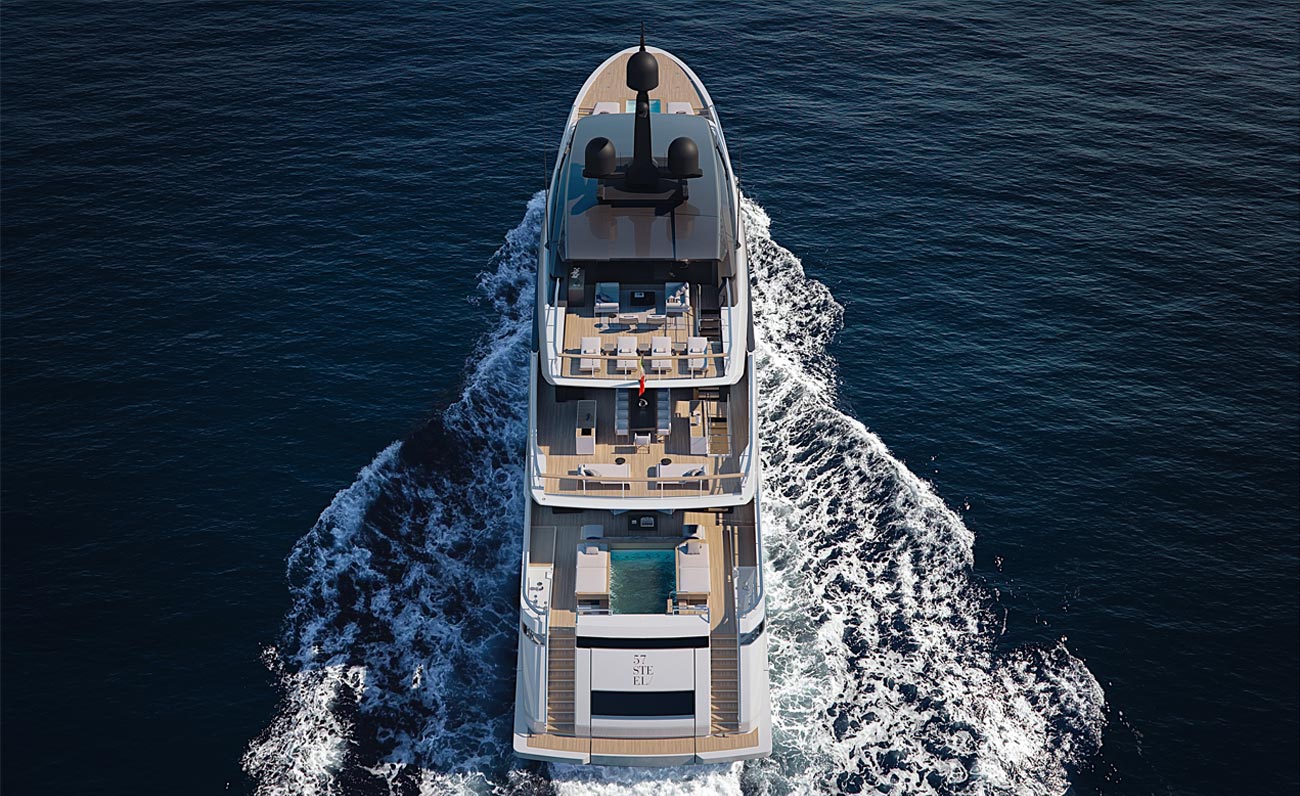 Questo nuovo superyacht spicca per i suoi spazi indoor e outdoor che hanno riscritto il concetto di viaggio. Il layout del 57Steel va pensato come un foglio dove si è scelto di cambiare la composizione della barca. La timoneria, che normalmente si trova a prua dellupper deck, viene ricollocata su di un altro ponte, offrendo la possibilità di utilizzare lupper deck in unottica diversa. Proprio qui troviamo infatti la cabina armatoriale affacciata sullampio Owner deck, un ponte privato che garantisce unesclusiva vista sul mare.