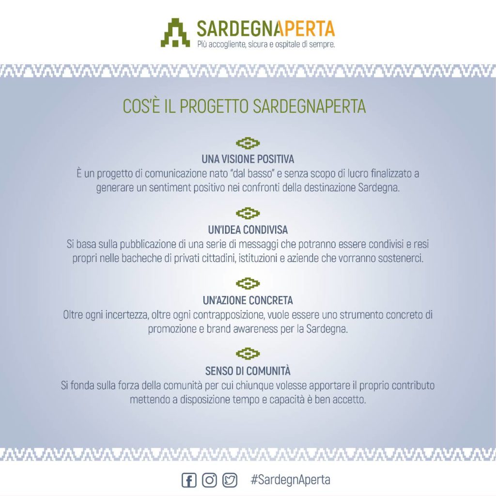 SardegnAperta. Ovvero, dovessero esserci ancora dei turisti indecisi, l’obiettivo è stanarli con questa comunicazione che dal basso, convince, informa e rassicura.