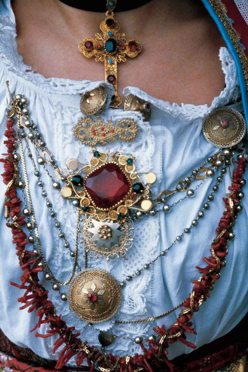 I gioielli in Sardegna venivano realizzati almeno fino alla fine dell’800 con le materie prime della terra. L’argento prevaleva tra i metalli impiegati perché le cave dell’Iglesiente ne erano ricche, mentre per impreziosire ogni filigrana o monile veniva spesso usato il corallo, abbondante sulle coste dell’isola o altre gemme preziose come i granati o la madreperla. Bottoni di oro e argento, catene con appese reliquie, croci e gemme e indossate per le cerimonie, orecchini e collane sono solo alcuni dei gioielli della tradizione, ma dovevano venire indossati con un criterio molto rigido che ancora oggi rimane in alcuni paesi più legati alla tradizione.
