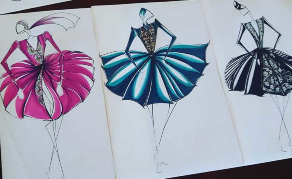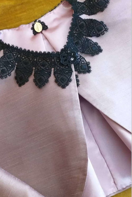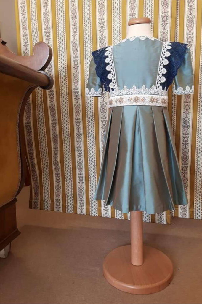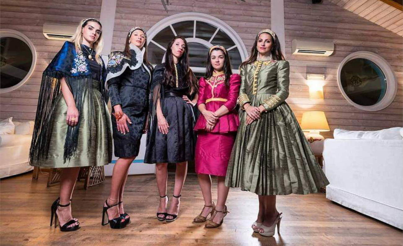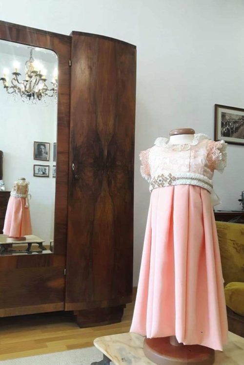 Stefania nell’ultimo anno di lavoro come commessa a Porto Cervo decide di crescere nella sua competenza tecnica. Si ritrova così a cercare la maestra d’arte di Sennori Vanna Sassu, nota per la sua abilità nel ricamo, ne nasce un rapporto fattivo e intenso, come ogni volta che l’apprendimento incontra la passione. «Ho sempre disegnato abiti, l’idea di realizzarli parte da me – dichiara Stefania – Monica si era specializzata nelle creazioni di accessori, oggi la sfida è rincorrere i tempi di consegna, ma ce la facciamo anche se ognuna di noi ha una figlia. Eppure, è questo che amiamo fare: il nostro lavoro, anche se ci tende come un elastico tra le due bimbe, le due famiglie e le due case da gestire.»