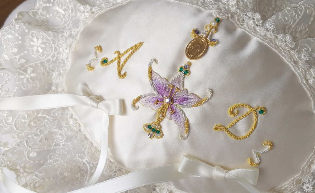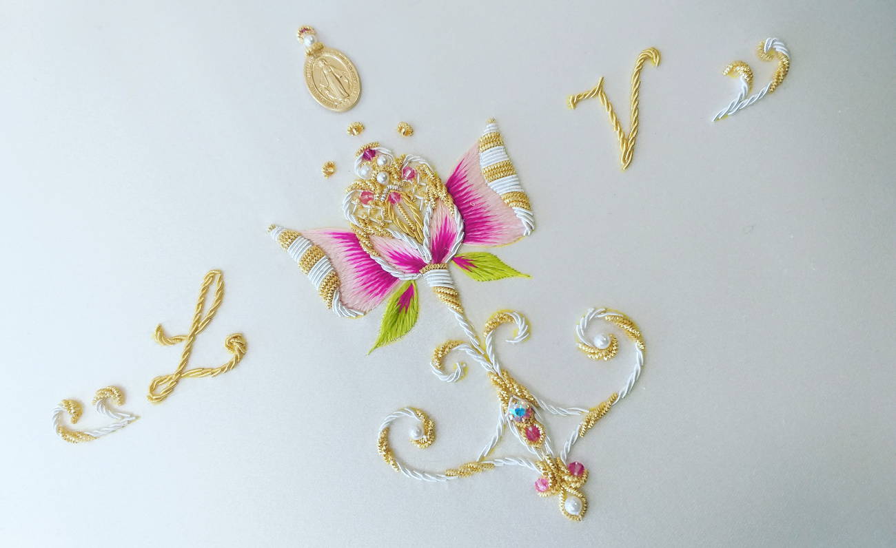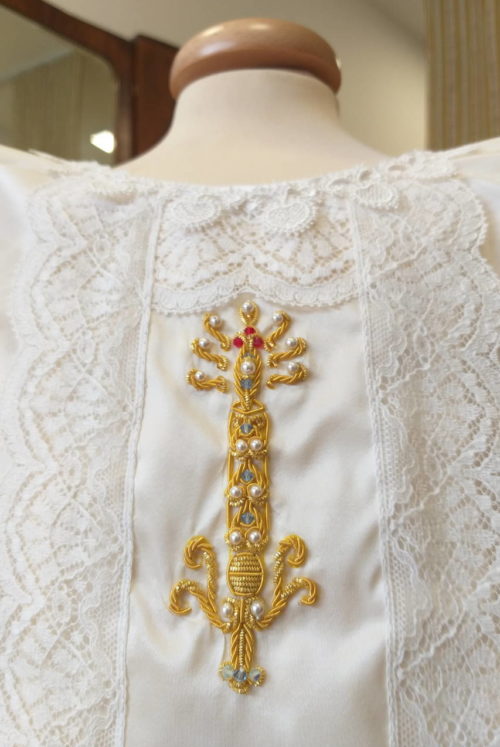 «In ognuna delle nostre realizzazioni mettiamo la medaglietta miracolosa della Madonna. Quella che è stata donata in Francia a Caterina Labouré - precisa Stefania - a cui siamo diventate devote da quando le bambine frequentano la scuola San Vincenzo di Olbia. Noi realizziamo le camicine dei neonati dette “vestina da battesimo”, gli abiti del battesimo, i cuscini per le fedi degli sposi, gli abiti da cerimonia e per le damigelle. Avevo voglia di imparare e, dopo che è nata mia figlia, ho tagliato il mio primo abito ma la conversione è arrivata l’estate prima dell’apertura dell’atelier. Realizzare tutto questo per me è trasmettere un valore. Oro seta e perle sono certamente materie preziose del nostro ricamo liturgico, ma il vero elemento che crea valore è fede. Poi arriva il resto e credo che ogni persona che ci commissiona un lavoro sia come guidata ad arrivare proprio qui. Quando scopri una verità di salvezza non ha senso tenerla per te, guardiamo l’altro come una persona che ci vene mandata e noi l’accogliamo, sempre. Non siamo qui solo per vendere, ci interessa sopravvivere in una maniera dignitosa, non ci sentiamo macchine per soldi, non lo saremo mai.»