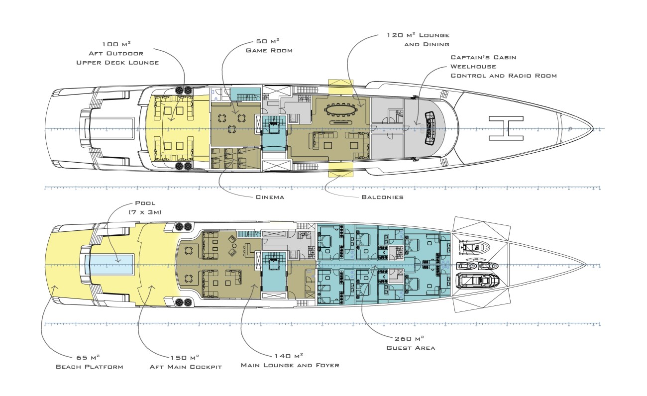 Il progetto immaginato da Spadolini presenta un\'area beach club di grandi dimensioni, perfetta per gli amanti del mare e dello stile di vita all\'aperto. La zona è dotata di una serie di servizi per il benessere e il relax, tra cui una palestra, un\'area bar, una zona sauna, massaggi e una piscina a sfioro di 7x3 metri con fondo vetrato, sospesa sulla piattaforma da bagno da 65 metri quadrati. Anche l’a spaziosa area lounge - con i suoi 150 metri quadrati - offre due terrazze apribili, che permettono agli ospiti di godere della vista sul mare e della fresca brezza marina. ll pozzetto principale superiore, situato a poppa, occupa altri 150 metri quadrati.