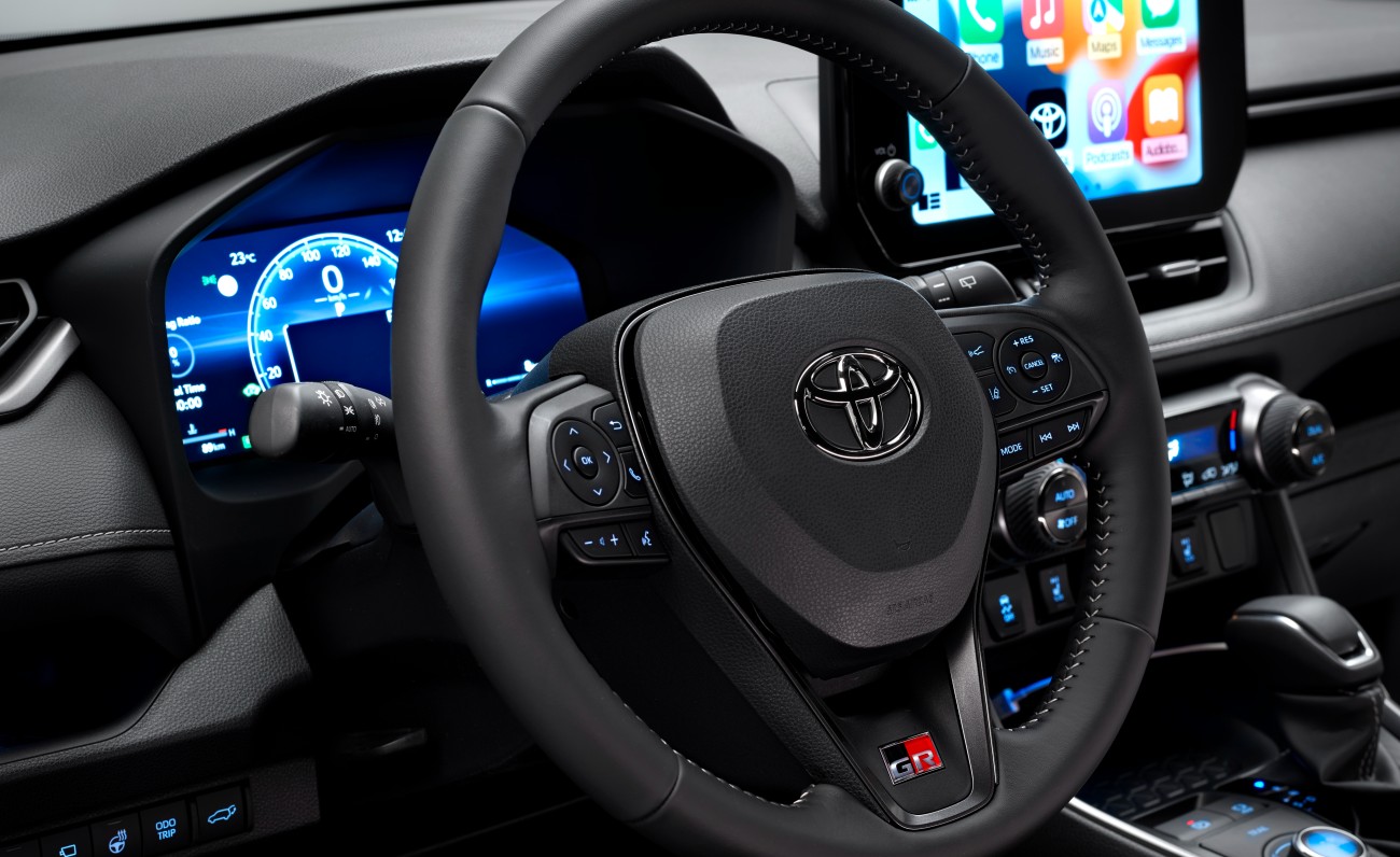 Anche gli interni della vettura sono progettati per accentuare il suo aspetto sportivo, a partire dai rivestimenti in finta pelle scamosciata e graffiature con il logo GR su poggiatesta e tappetini. La plancia comandi è inoltre dotata di un sistema multimediale con display ad alta definizione da 10,5 pollici e di cockpit digitale altamente personalizzabile da 12,3 pollici. Altre funzionalità incluse sono il sistema di pre-collisione migliorato e l\'assistenza al sistema di sterzo. Come tutti i modelli GR Sport, anche la nuova RAV4 è dotata di regolazione elettrica dei sedili anteriori e di un Panoramic View Monitor a 360°. (Francesco di Nuzzo)