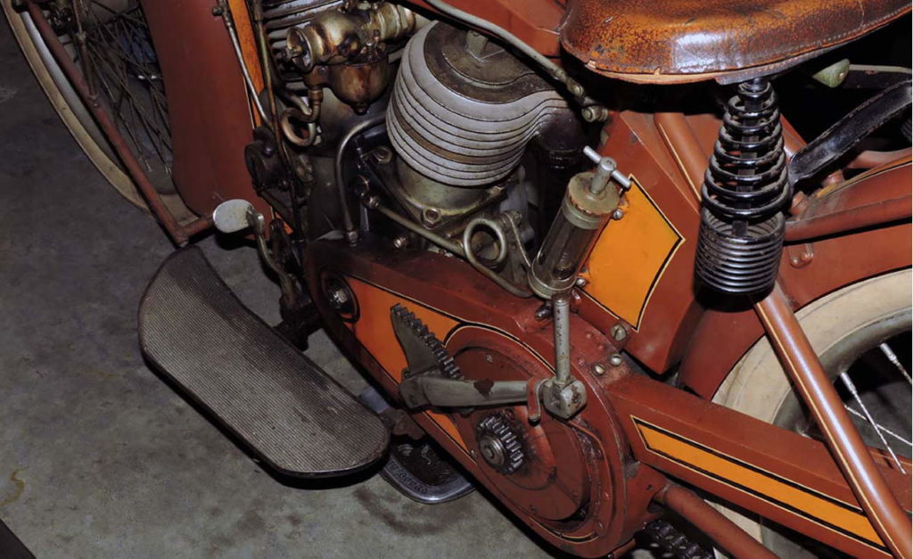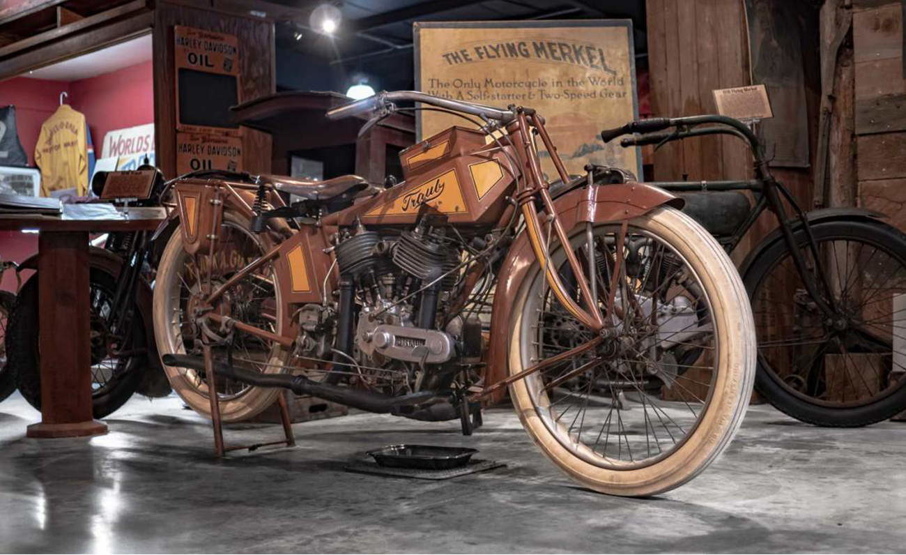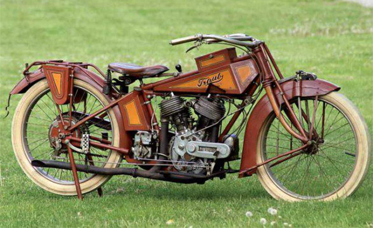 È la Traub, un solo esemplare esistente, perfettamente funzionante, in grado di raggiungere una velocità di 85 miglia orarie, circa 137 km/h e, per ora al Museo Wheels Through Time (Ruote Nel tempo) di Maggie Valley, North Carolina Usa. Costruita tra l\'inizio del 1910 e il 1920 fu scoperta per caso nel 1967 durante dei lavori di ristrutturazione di un palazzo, nascosta dietro una finta parete. In seguito l\'acquistò un negoziante di biciclette di Chicago e, a fine anni 70, Bud Ekins, - controfigura di Steve McQueen - mentre stava lavorando alle riprese del film The Blues Brothers. Successivamente passò al collezionista e restauratore Richard Morris, e nel 1990 a Dale Walksler, curatore del Wheels Through Time Museum.