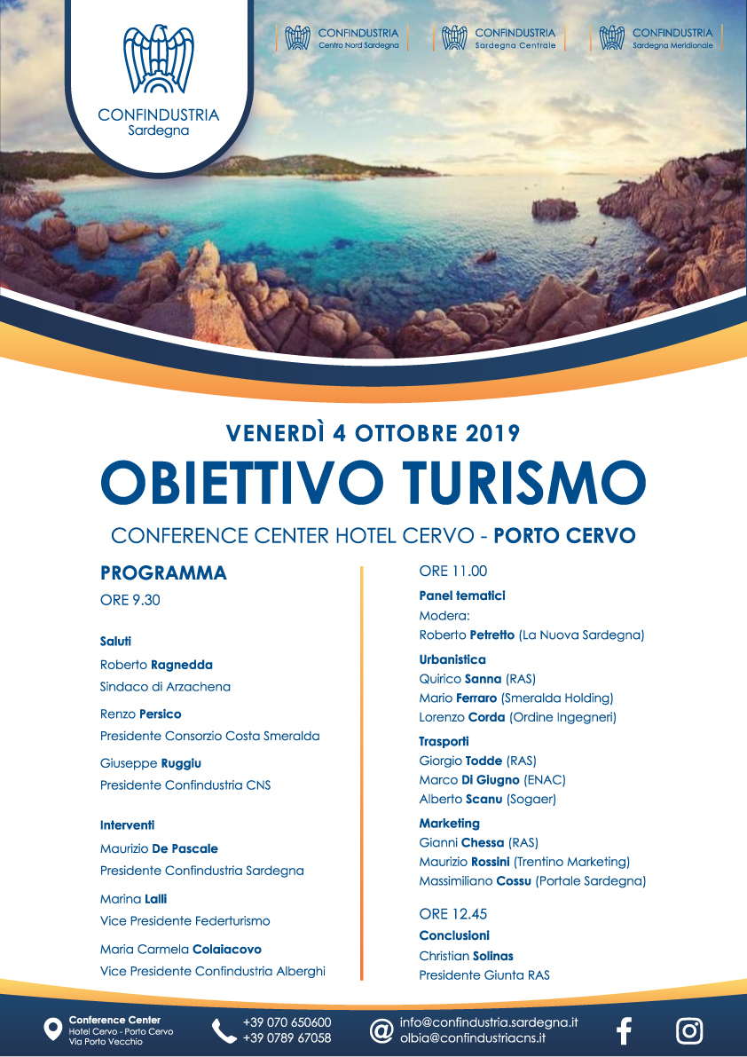 Dopo i consueti saluti del sindaco di Arzachena Roberto Ragnedda, del Presidente del Consorzio Costa Smeralda Renzo Persico, e del Presidente di Confindustria CNS Giuseppe Ruggiu, Obiettivo Turismo vedrà al centro una serie di interventi di esperti, da Maurizio De Pascale, Presidente di Confindustria Sardegna, a Marina Lalli, Vice Presidente di Federturismo. Alle 11 si terranno poi degli contributi da parte di alcune personalità di spicco, come il CEO di Smeralda Holding Mario Ferraro e gli assessori competenti Quirico Sanna (urbanistica), Giorgio Todde (trasporti) e Gianni Chessa (marketing). La giornata terminerà infine alle 12.45 con la partecipazione del Presidente della Giunta Regionale Christian Solinas.