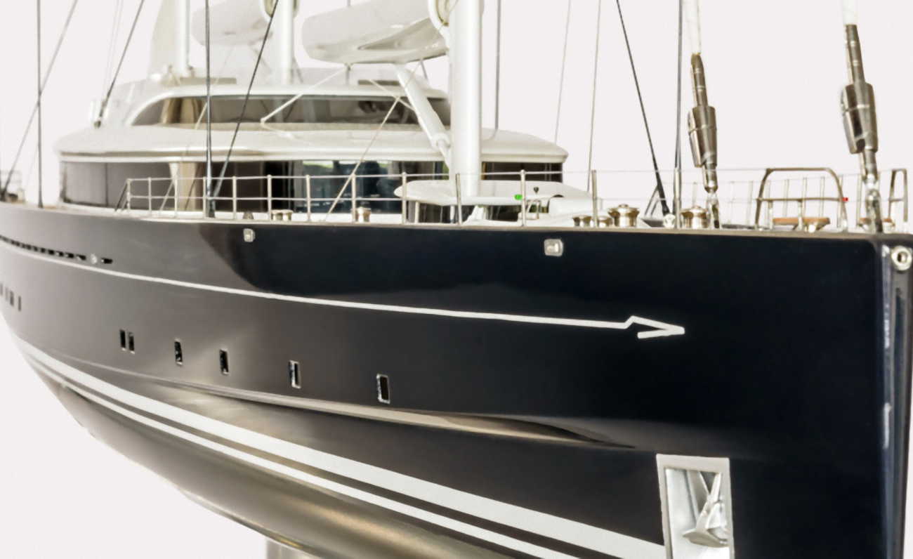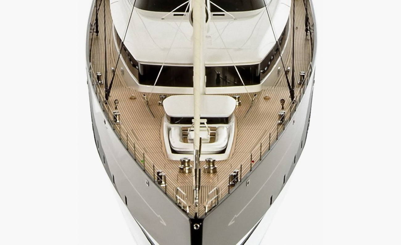 Il design dell\'ingresso \'equipaggio sul ponte di prua si lega con l\'aspetto della tuga principale. Dando un senso di continuità e contemporaneamente senza essere visibile. Notevole l\'alta prua a piombo, la linea di galleggiamento molto lunga, lo scafo snello che, insieme alle grandi aree delle vele permettono allo yacht alte velocità sfruttando la forza del vento. Altre caratteristiche principali da evidenziare includono un ampio ponte prendisole con controlli al flybridge, una cabina di guida riparata sul ponte sottostante, con zona bar, divani e una grande sala da pranzo all\'aperto da cui, grazie a un esclusivo sistema di porte scorrevoli, creato da Rondal, sarà possibile accedere al salone principale con una transizione senza soluzione di continuità.