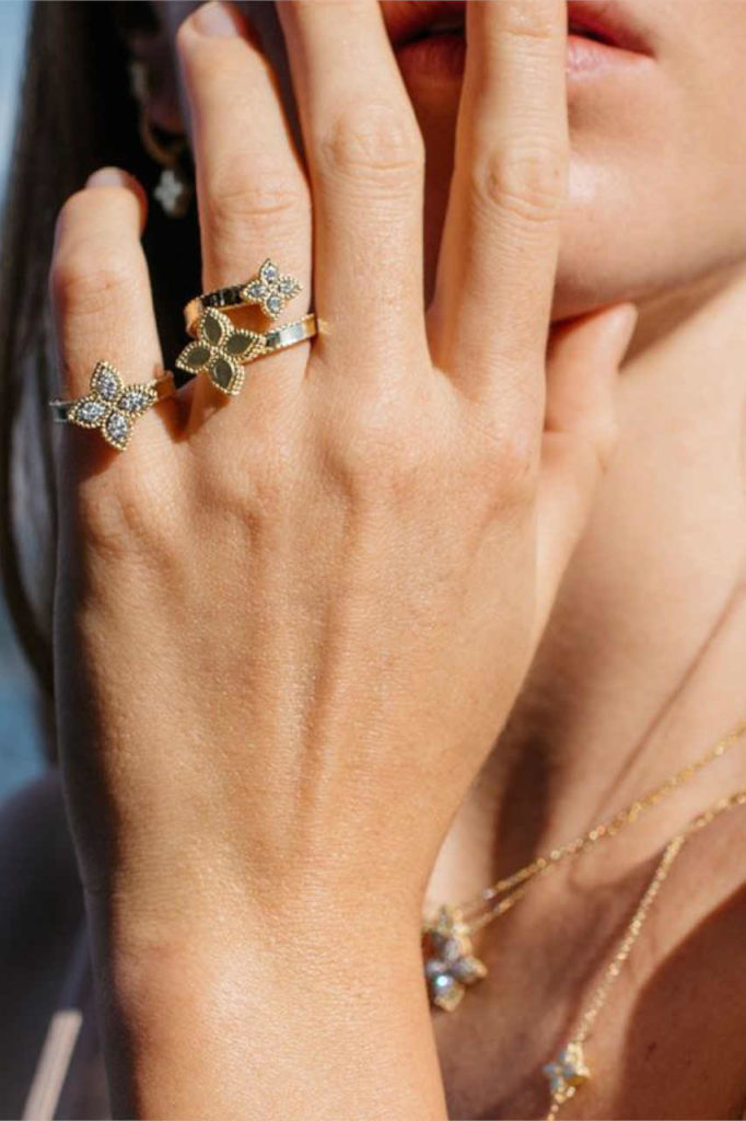 I gioielli della collezione presentano una lavorazione a filo ritorto caratteristica, con superfici ora lisce e ora ruvide, ispirandosi alle diverse caratteristiche dei fiori, mentre la forma iconica dei petali rimane costante in ogni creazione, pur se declinata in un’infinita varietà di sfumature.