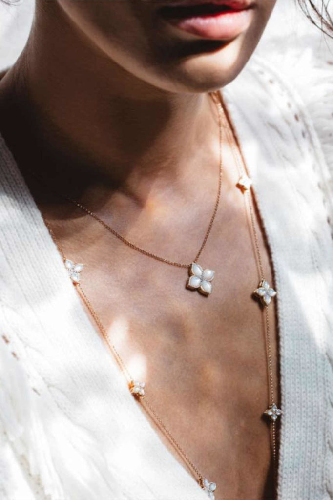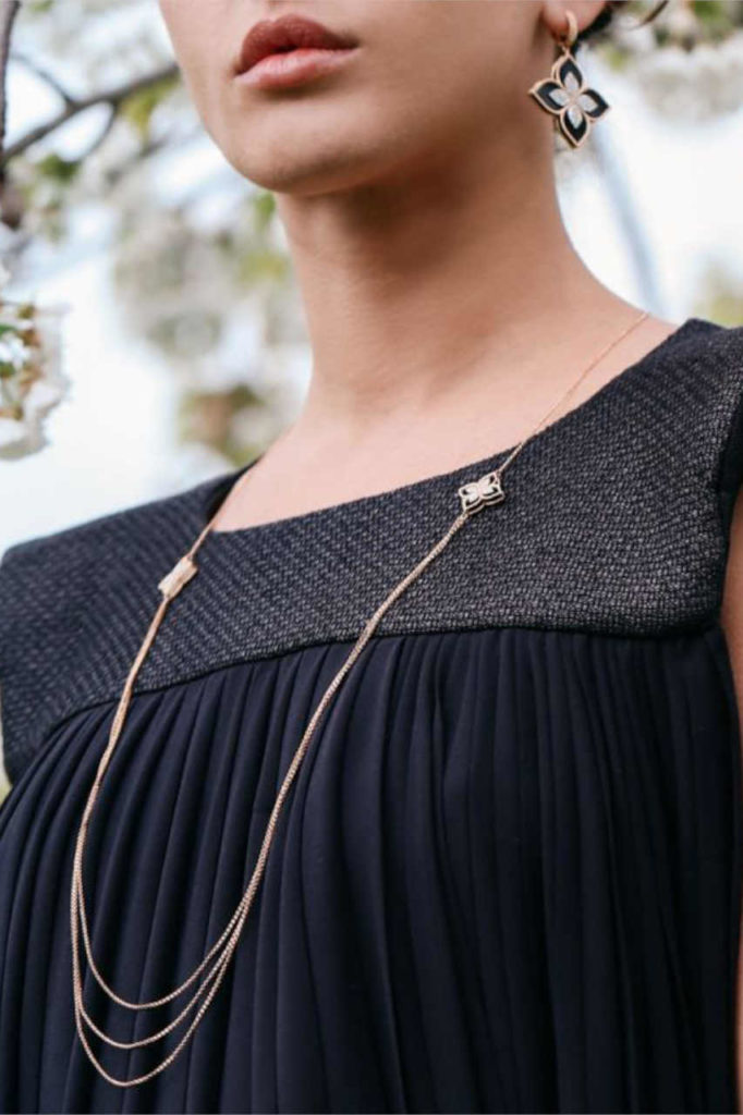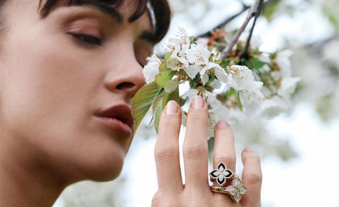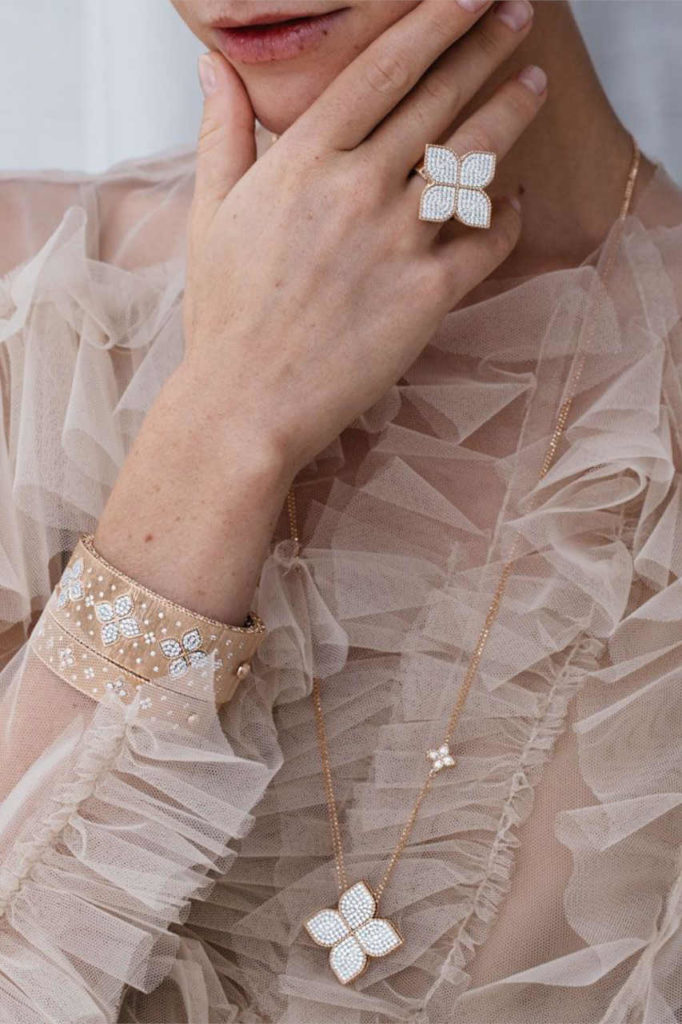 Le collane e i bracciali sfoggiano una moltitudine di fiori di varie dimensioni che si susseguono come in un vero e proprio giardino. Negli anelli e nei pendenti il fiore sboccia da solo, assumendo il ruolo di protagonista assoluto di stile e di emozione, dando corpo a un gioiello sublime e aggraziato che si adorna di diamanti, madreperle, o malachiti e giade.