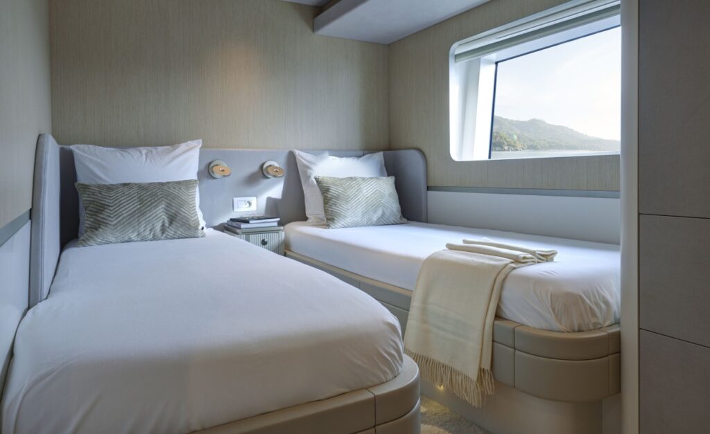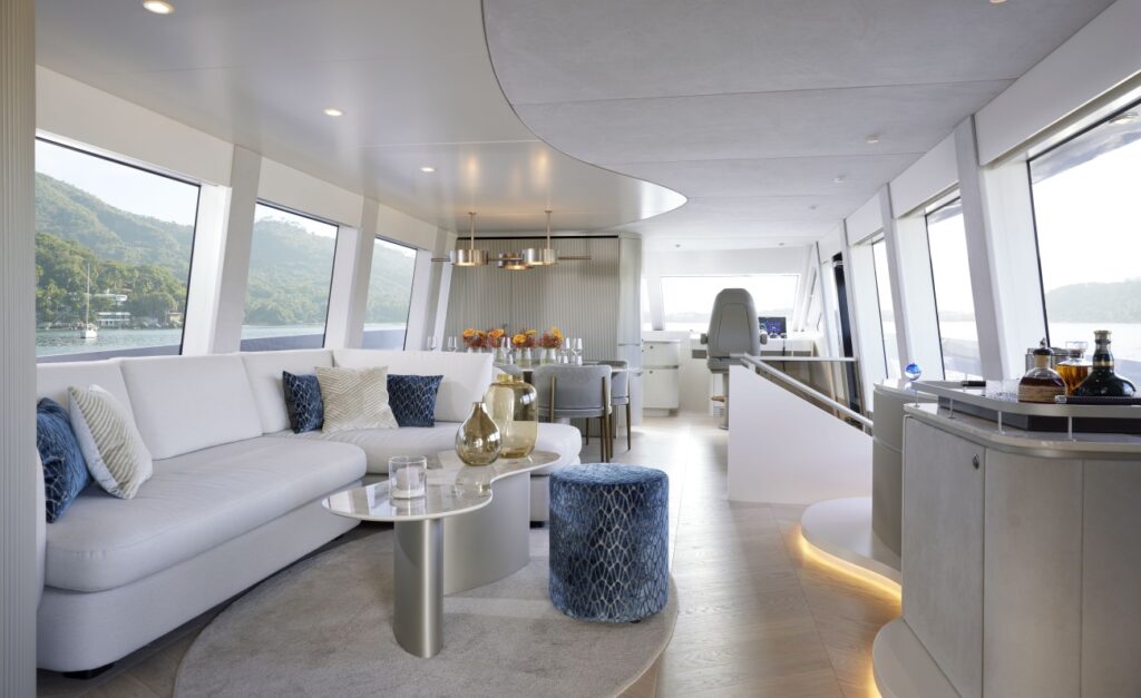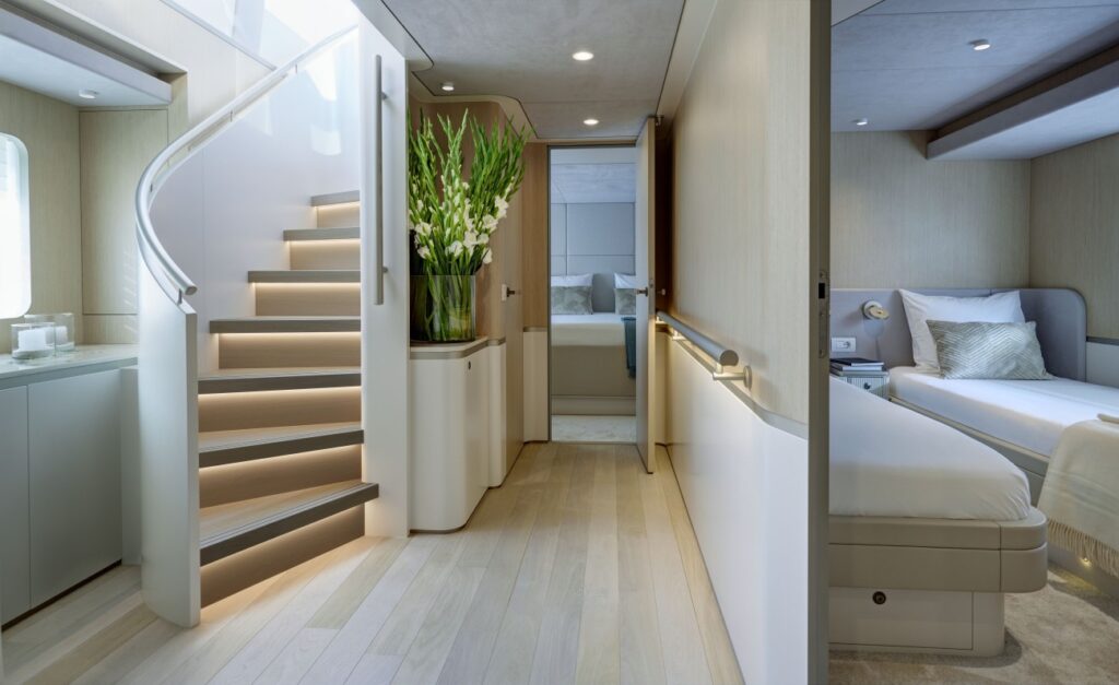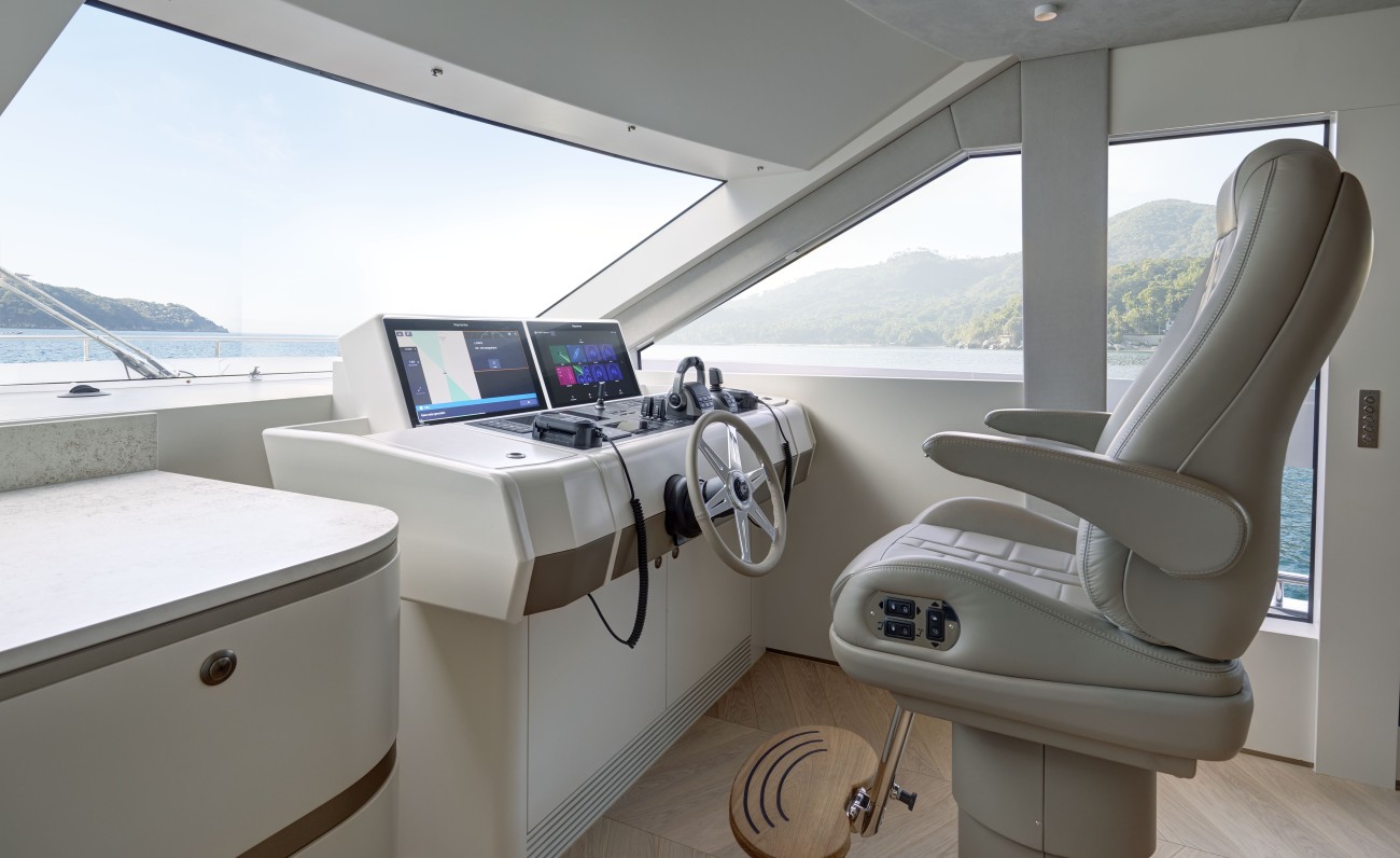 Gli ambienti esterni del Falcon si caratterizzano per l\'ampio ponte di poppa di 4,5 metri, che include una zona pranzo all\'aperto panoramica per godersi il paesaggio in totale relax. Sul ponte di prua è invece posizionata un\'area prendisole, mentre sul flybridge una seconda zona pranzo. Gli interni sono costituiti da un unico ponte principale arredati con cucina, sala da pranzo per otto persone, salone, angolo bar e bagno. La zona notte dello yacht include una suite armatoriale a tutto baglio, due cabine centrali - una Vip e una trasformabile da matrimoniale a doppia - e una cabina equipaggio per due persone.