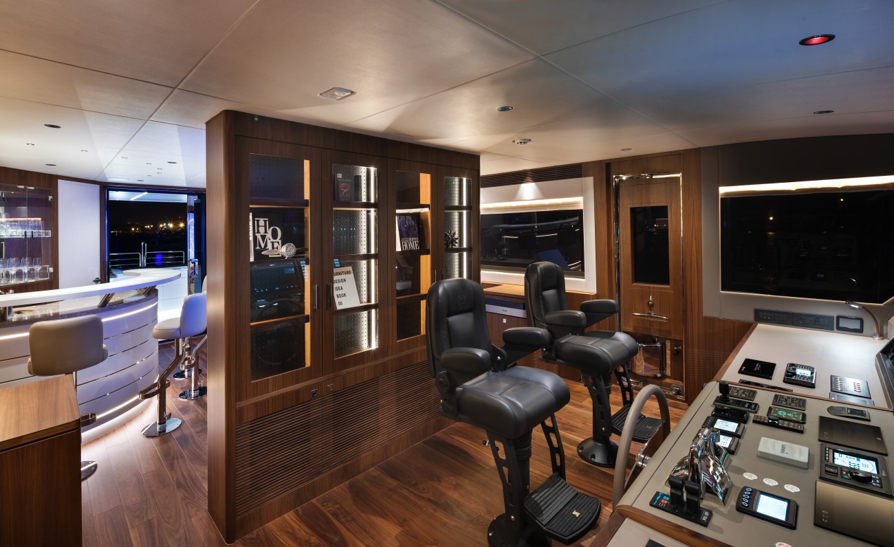 Gli ambienti interni dell\'imbarcazione si caratterizzano per la loro eleganza e per l\'arredo che incorpora diversi elementi d\'arte moderna. Nella zona di poppa si trova il salone principale, arredato con un confortevole divano ad L, una tavola per dieci persone e un lampadario rettangolare di design Rhiannon. A prua, separata da una protezione Hi/lo di vetro con motivo a inchiostro, si trova invece la cucina, attrezzata con un frigorifero per vino Thermador. La cabina armatoriale è posizionata sul ponte ed è dotata di due posti letto. Dalla una scala galleggiante si arriva al ponte superiore e alla zona di sottocoperta, dove sono presenti ulteriori quattro cabine con bagno privato, tra cui tre VIP con dimensioni di un letto matrimoniale e una cabina trasformabile, mentre gli alloggi dell\'equipaggio sono situati verso la sala macchine. (Francesco di Nuzzo)
