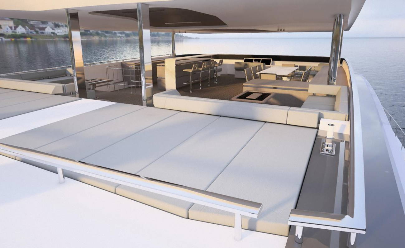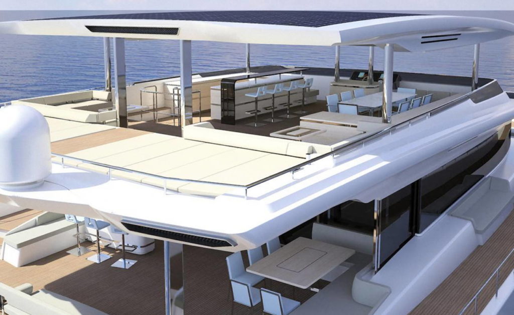 Il risultato finale è un\'imbarcazione dalle linee pulite e senza tempo, un susseguirsi di rette interrotte da finestroni che “inondano” di luce naturale il salone e gli spazi per gli ospiti, offrendo allo stesso tempo viste panoramiche. Dotato di enormi pannelli solari, il flybridge da un tocco sportivo con griglie d’aria orizzontali ispirate alle supercar. Fuori sia a poppa che a prua non mancano gli spazi per ospitare aree sociali ampie ma con privacy. Sempre a poppa, dove si trova la cabina di guida, nel pozzetto sono presenti un salone lounge e bar, mentre la zona frontale è perfetta per rilassarsi al sole, grazie a un divano fronte mare e prendisole.
