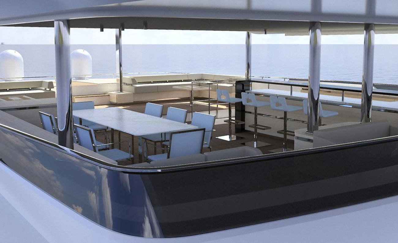 La sky lounge aggiuntiva sul ponte superiore aiuta a prolungare il periodo di utilizzo della barca. Lo spazio extra in cima estende le aree sociali a bordo, offrendo allo stesso tempo nuove opportunità in termini di layout. In alternativa è possibile avere un enorme flydeck di 90 m², che può essere progettato come un \"mazzo del proprietario\" con una vasta suite privata e vista a 360 gradi e una terrazza. Un salone di circa 60 m² sul ponte principale largo 10,95 m², è equipaggiato con cucina interna, salone e zona pranzo. Il ponte inferiore ospita da 4 a 6 cabine ospiti e 1-2 cabine equipaggio. Tutte offrono cuccette doppie o matrimoniali e hanno docce separate. È possibile creare personalizzazioni a richiesta.