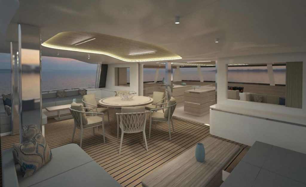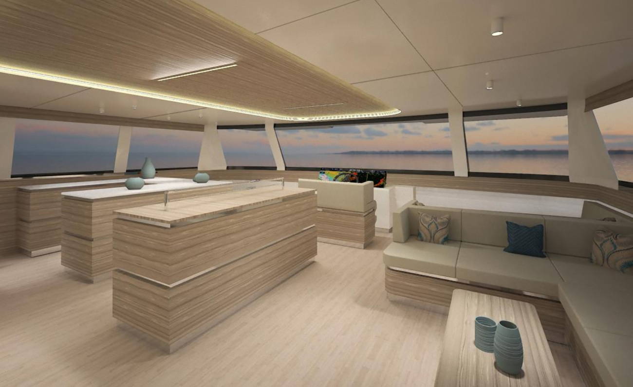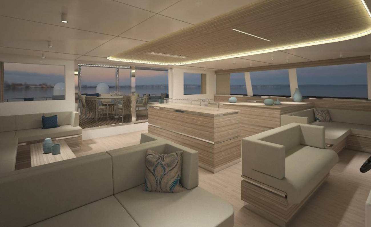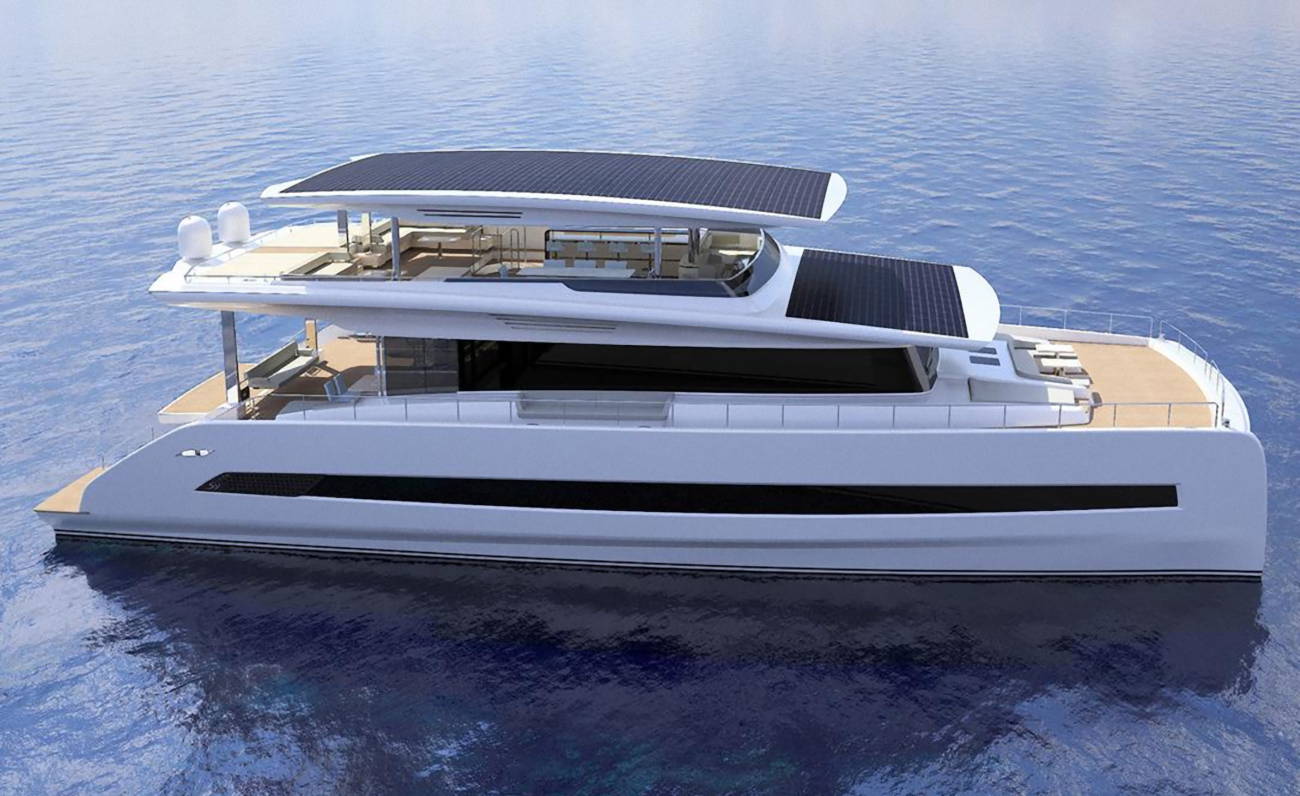Ma se quella era una speranza o una previsione, questa è realtà, grazie all\'evoluzione avuta dalla tecnologia del settore. Infatti, l\'ampia area libera dei top dei due ponti, coperta e tuga, superiori ospita numerosi pannelli solari che permettono una navigazione silenziosa e autosufficiente dal raggio praticamente illimitato e senza creare alcun inquinamento anche se, come sottolinea lo shipyard a bordo è previsto, per sicurezza, un generatore, il cui unico scopo è ricaricare le batterie nel caso in cui sia richiesta una maggiore velocità per lunghi periodi di tempo o quando il maltempo si prolunga per diversi giorni. Altro fattore interessante è la forma: il catamarano è comodo non solo navigare ma anche perché offre una grande stabilità grazie ai due scafi paralleli. Senza dimenticare la totale mancanza di vibrazioni che, invece, si genererebbe in presenza di motori.