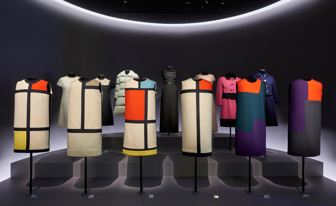 1. “Homage to Piet Mondrian”, ”Hommage to Serge Poliakoff” cocktail dresses. Autumn-winter 1965 haute couture collection. Retrospective show, Centre Pompidou, Paris, January 22, 2002 © Yves Saint Laurent / photo Guy Marineau